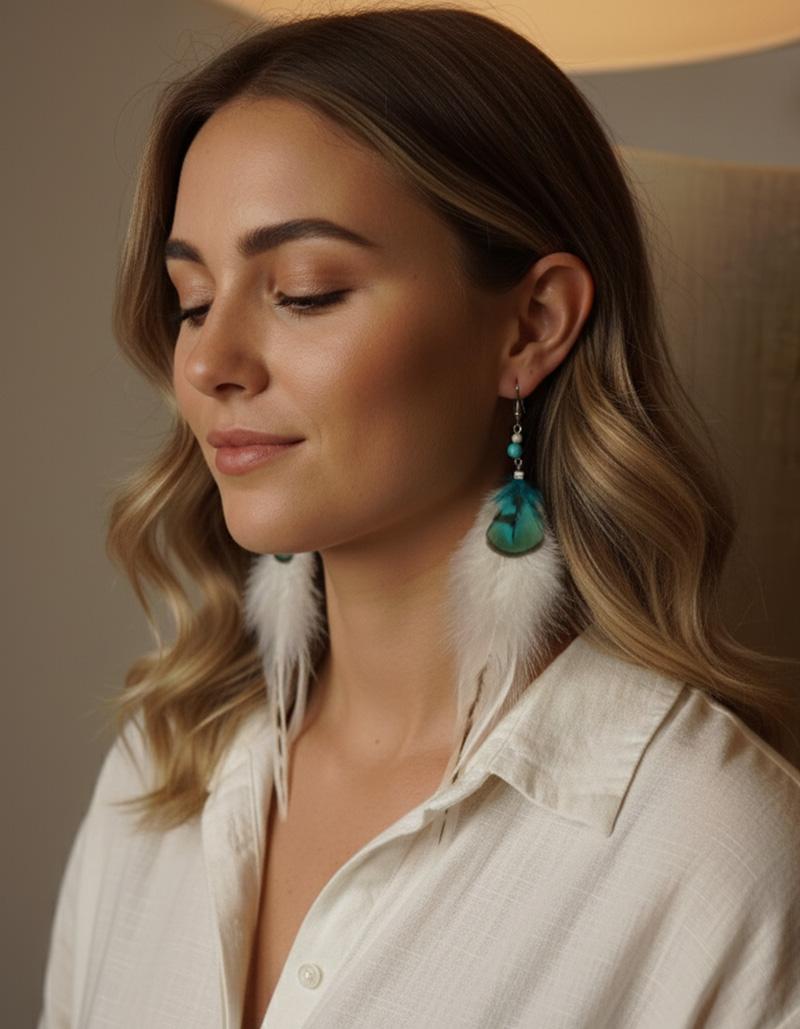 Am Tag des Festivals setzte Emily die Angel Eyes Ohrringe mit einem Lächeln auf und spürte sofort die magische Ausstrahlung, die von ihnen ausging. Die Grün-Türkistöne funkelten im Sonnenlicht und die weißen Federn bewegten sich leicht im Wind, während die bunten Perlen bei jedem Schritt fröhlich klapperten. Sie fühlte sich wie ein Teil der Natur, verbunden mit den Elementen und bereit, die Freude des Festivals zu erleben.