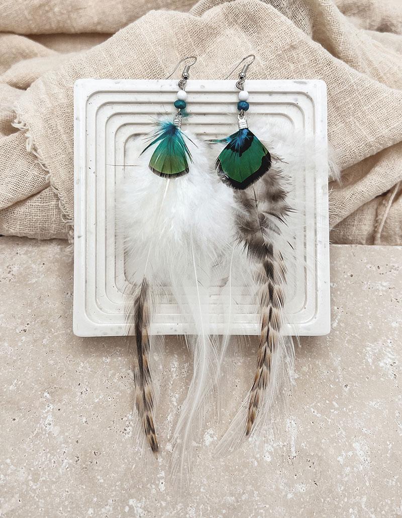 Unsere Angel Eyes Ohrringe kombinieren tolle Grün-Türkistöne mit weißen Federn und bunten Perlen. Sie stammen aus unserer Festiva Kollektion.