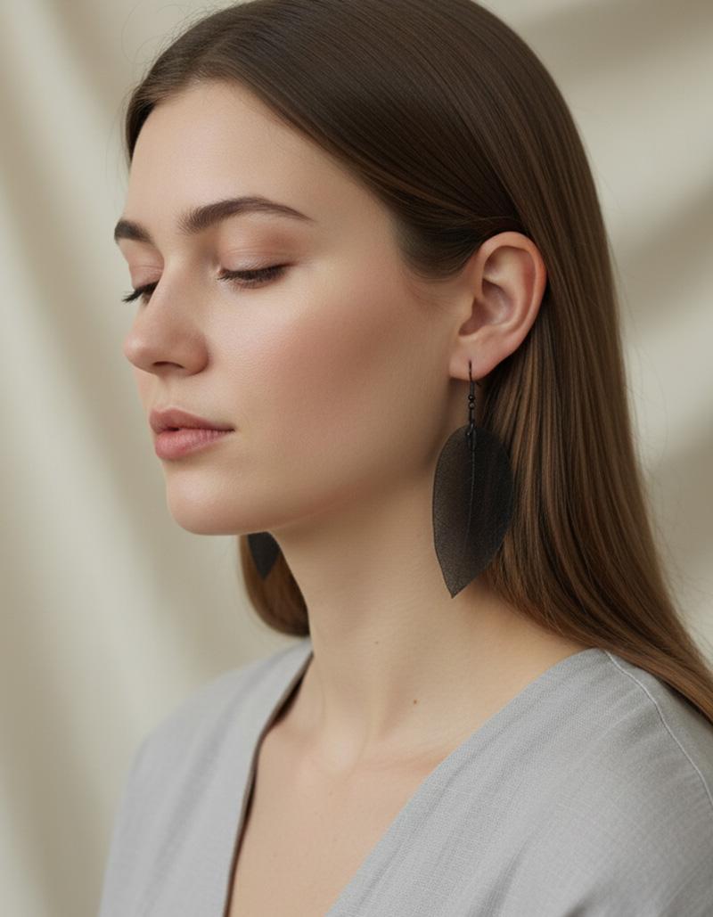 Am Abend des Dinners setzte Eva die Leaf Love Black Ohrringe an und betrachtete sich im Spiegel. Die filigranen Blätter schimmerten sanft im Licht und brachten ihre natürliche Schönheit zum Strahlen. Sie fühlte sich mit der mystischen Atmosphäre der Nacht verbunden und bereit, den Abend mit Stil und Anmut zu genießen.